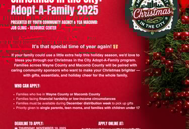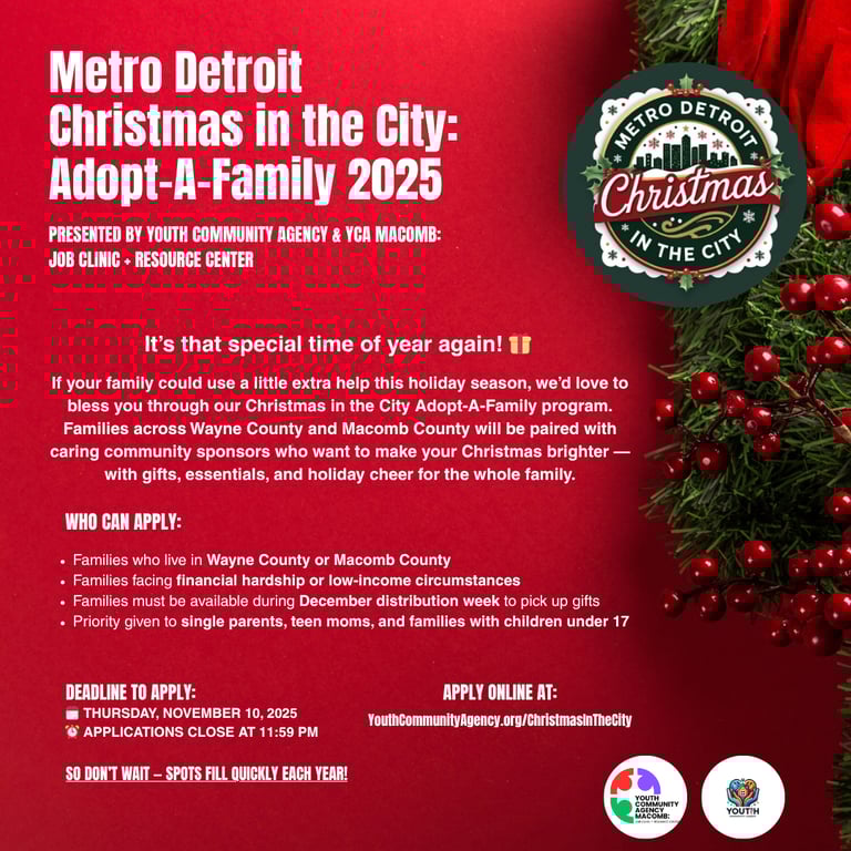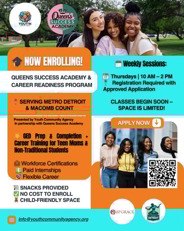 At Youth Community Agency (YCA), our mission is to empower teen moms and young families throughout Metro Detroit by addressing the root causes of poverty through intentional, equity-centered support. We focus on expanding access to education, career readiness, and entrepreneurship opportunities, while providing trauma-informed wellness services, essential housing resources, and innovative food access solutions.