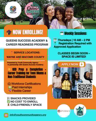 At Youth Community Agency (YCA), our mission is to empower teen moms and young families throughout Metro Detroit by addressing the root causes of poverty through intentional, equity-centered support. We focus on expanding access to education, career readiness, and entrepreneurship opportunities, while providing trauma-informed wellness services, essential housing resources, and innovative food access solutions.